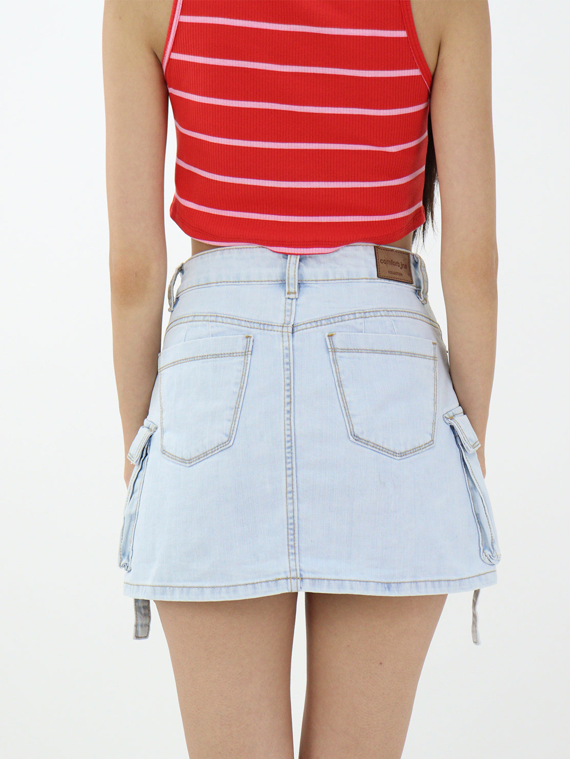 Falda de mezclilla cargo, con bolsillos en la parte delantera, cierre de botón y cremallera. Lavado azul claro, ligeramente ensuciado, aspecto sucio.