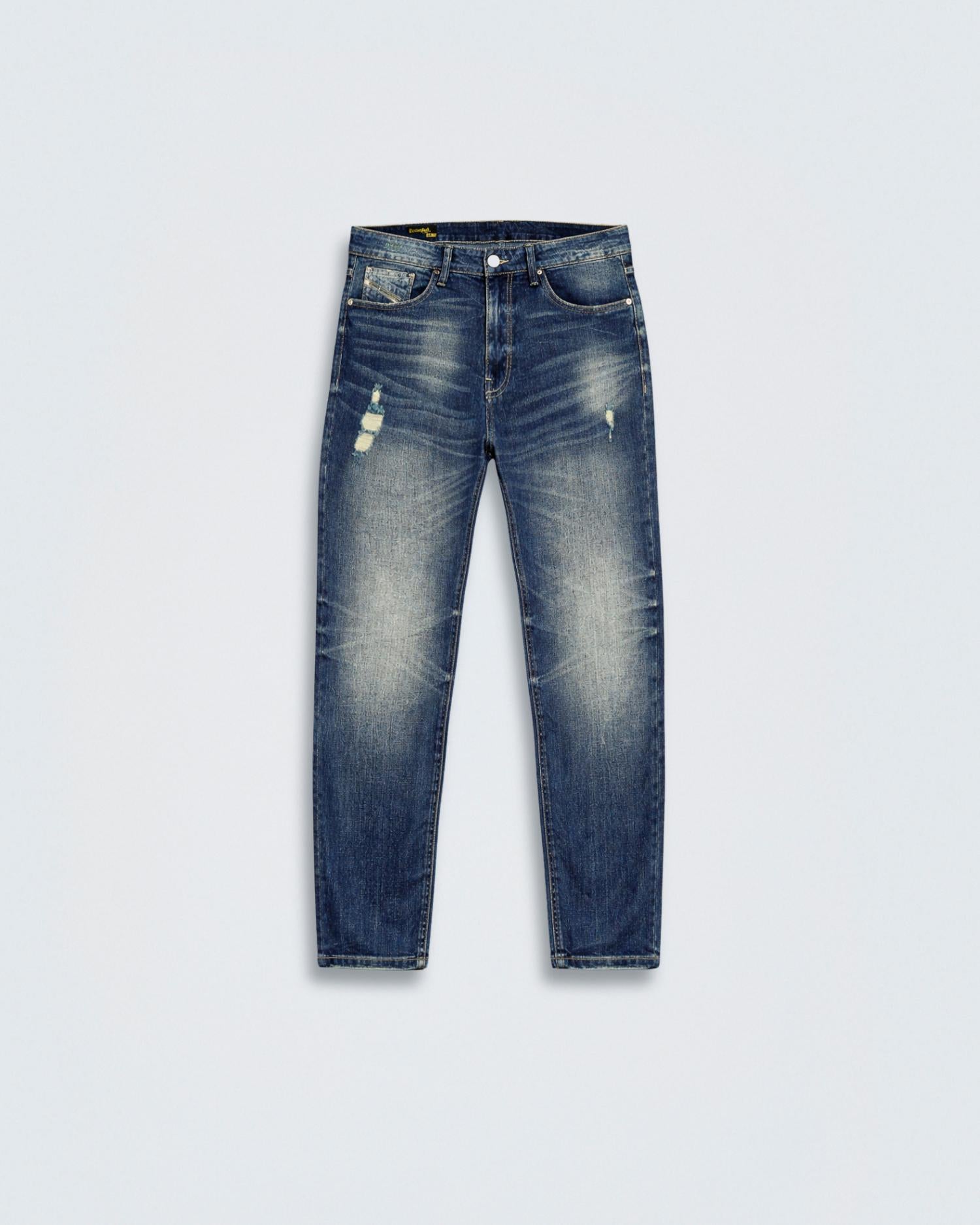 Jeans regular de talle alto, con bolsillos en la parte delantera y trasera, cierre de botón y cremallera, pierna ajustada. Lavado azul con tinta, ligeramente ensuciado, aspecto usado.