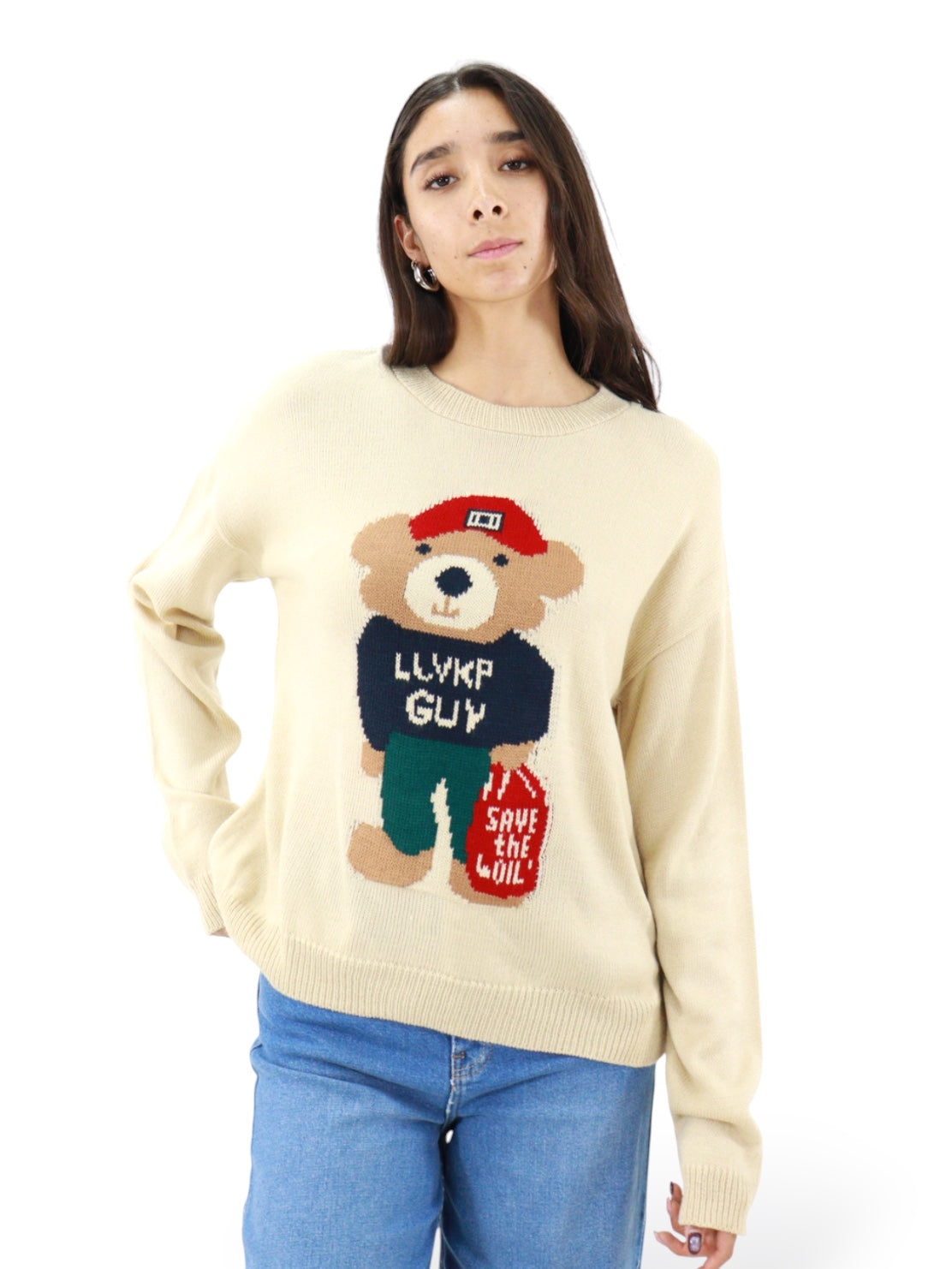 Suéter cerrado de color beige con estampado de oso